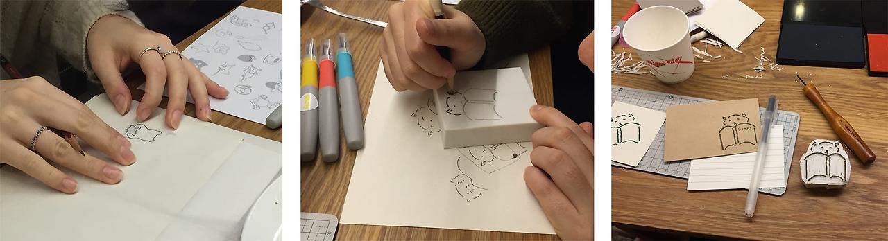 -> 제공된 지우개 크기에 맞춰 도장 조각. (조각도를 다루는 방법을 알려드려요.)