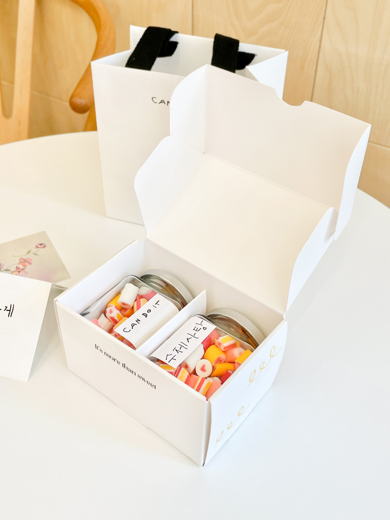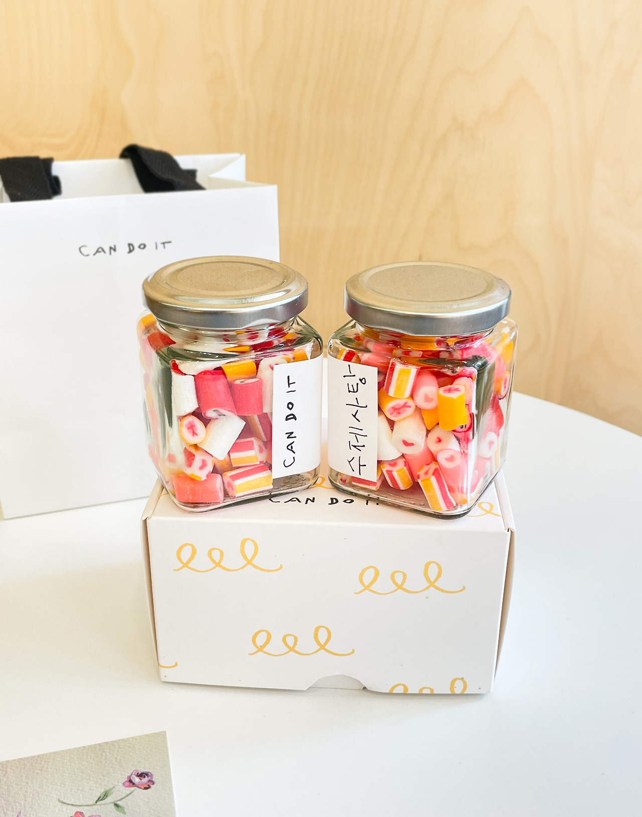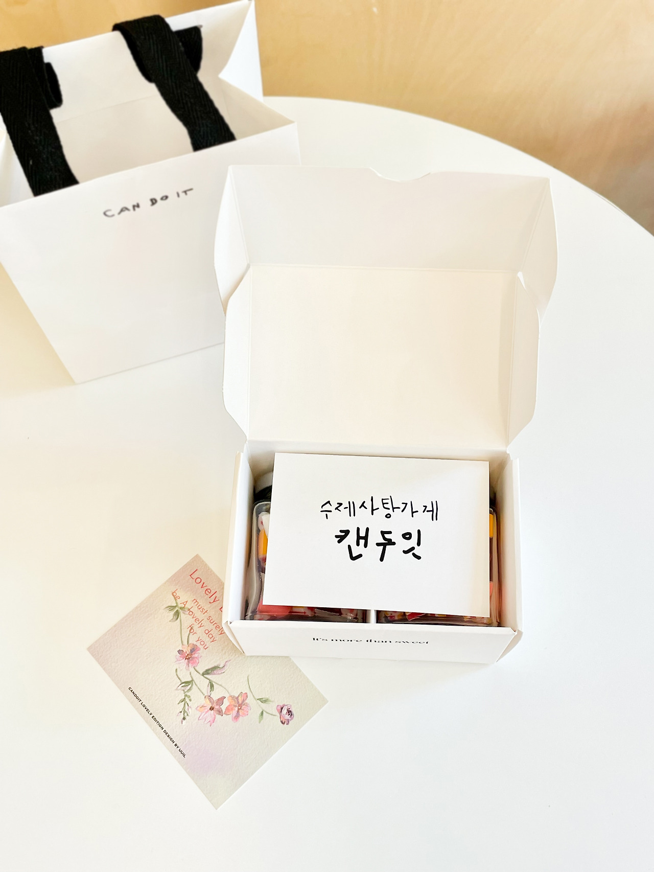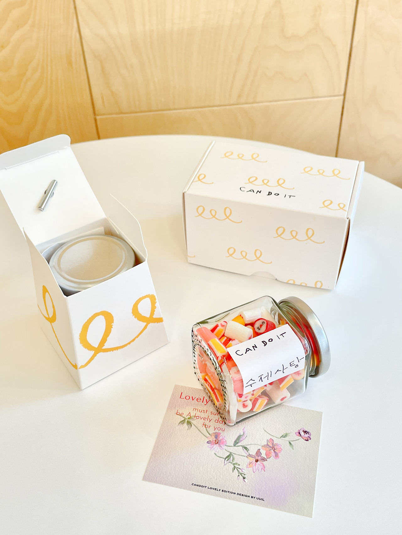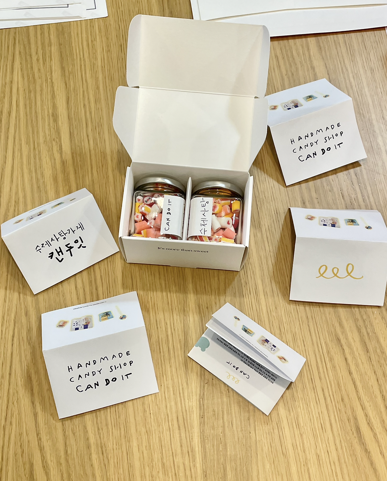 1차로 캔두잇의 전체 디자인이 일단락되고- 틈틈히 시즌에 따른 디자인이 추가되었다. 할로윈이나 크리스마스 시즌 등. 그리고 시간이 지나 더 밀폐력이 좋은 유리병으로 바꾸면서 계획중인 박스 패키지를 이참에 만들기로 결정한 째진. 당시 베트남 출장으로 바빴던 나는 회의에만 참석하고 이번 박스 디자인은 사공혜지가 맡아주었다. 알아서 잘 딱 깔끔하게 센스있게 뽑아준 사공혜지. 종종 사장님의 과한 로고 사랑을 말려주면서 ^^; 평병함 사각 유리병이지만 혜지의 감각적인 캘리와 캔두잇의 영롱한 사탕으로 특별한 패키지가 되었다.