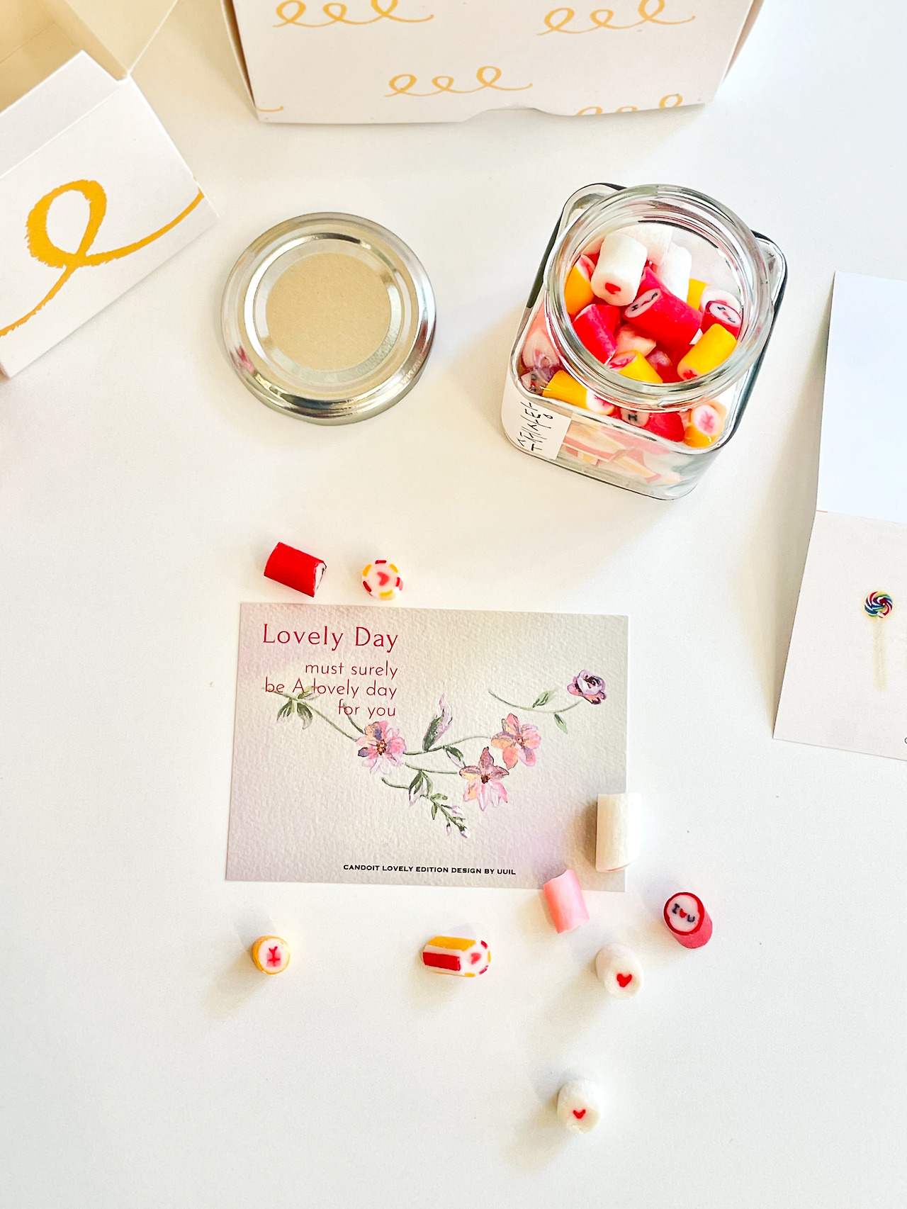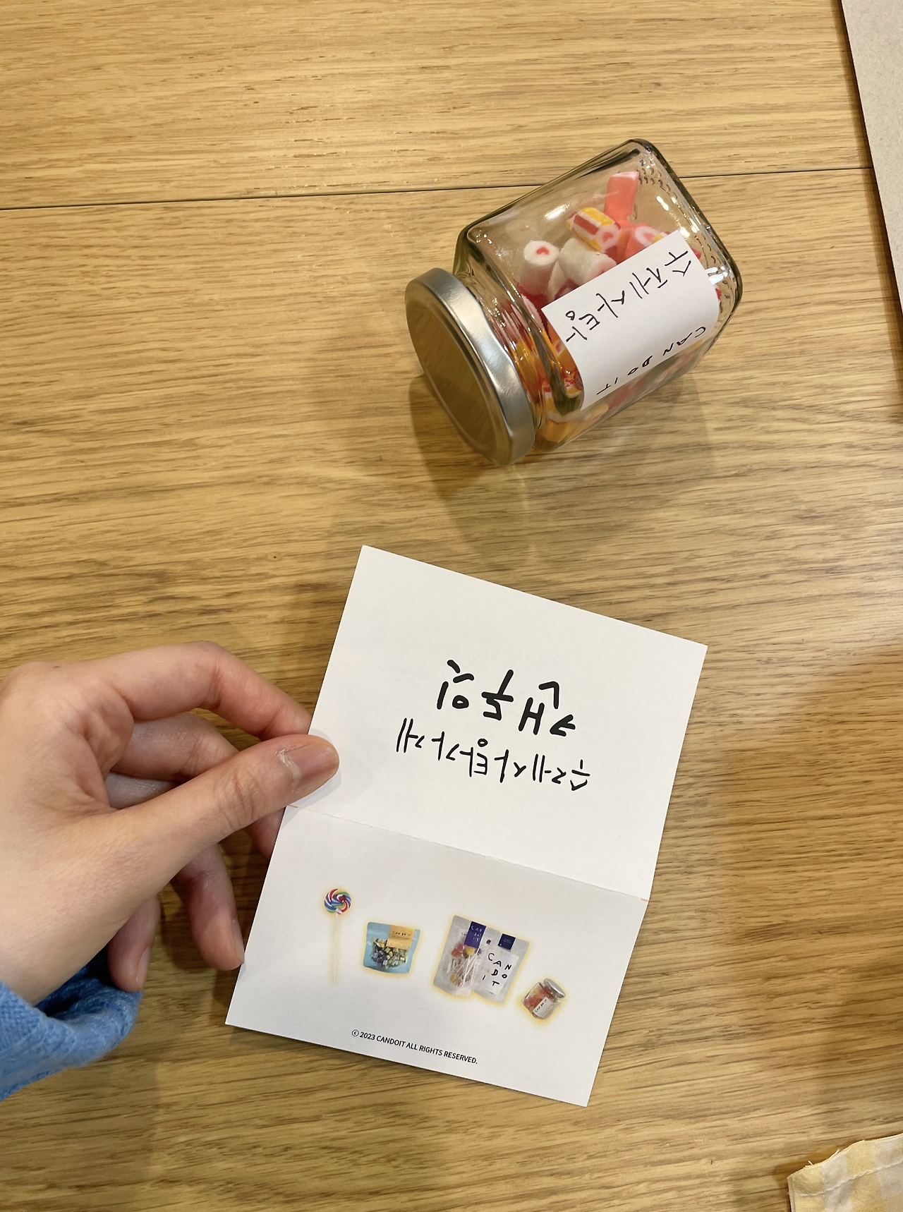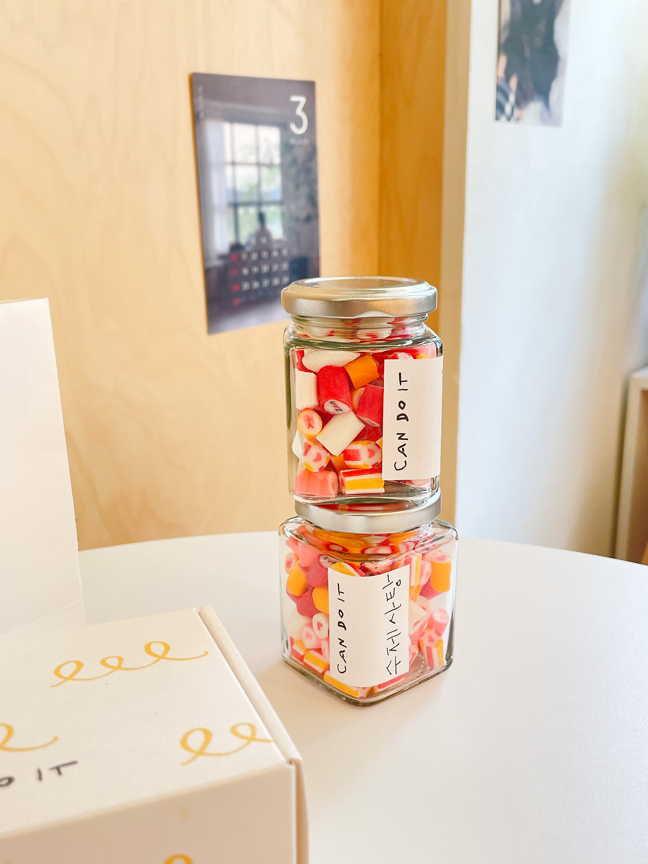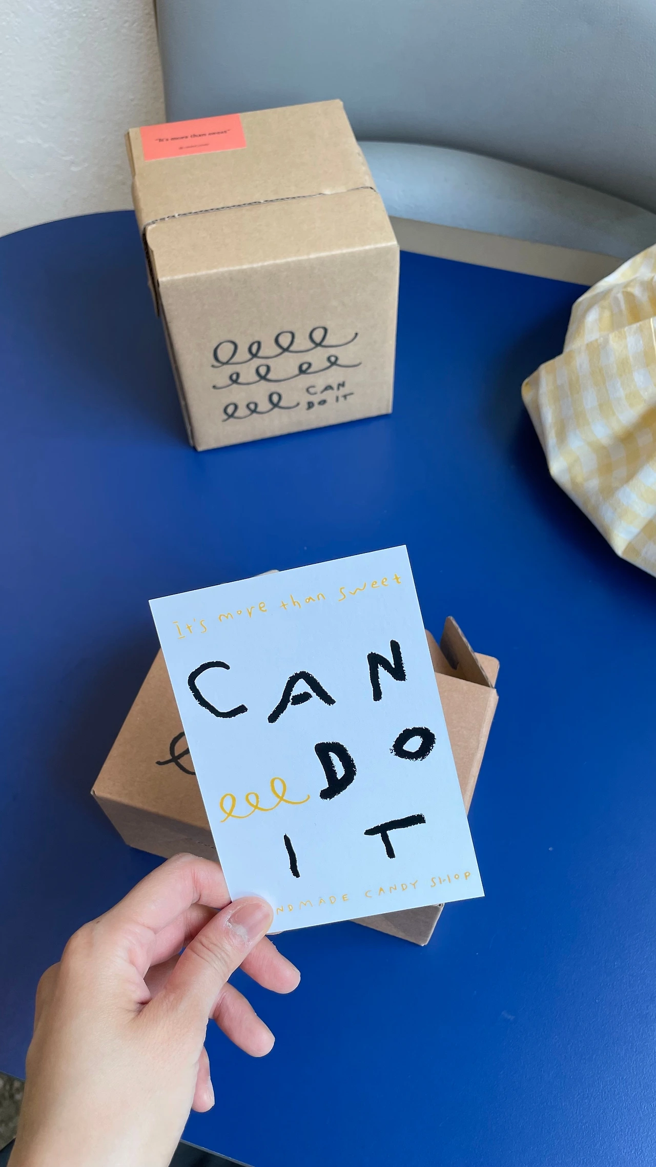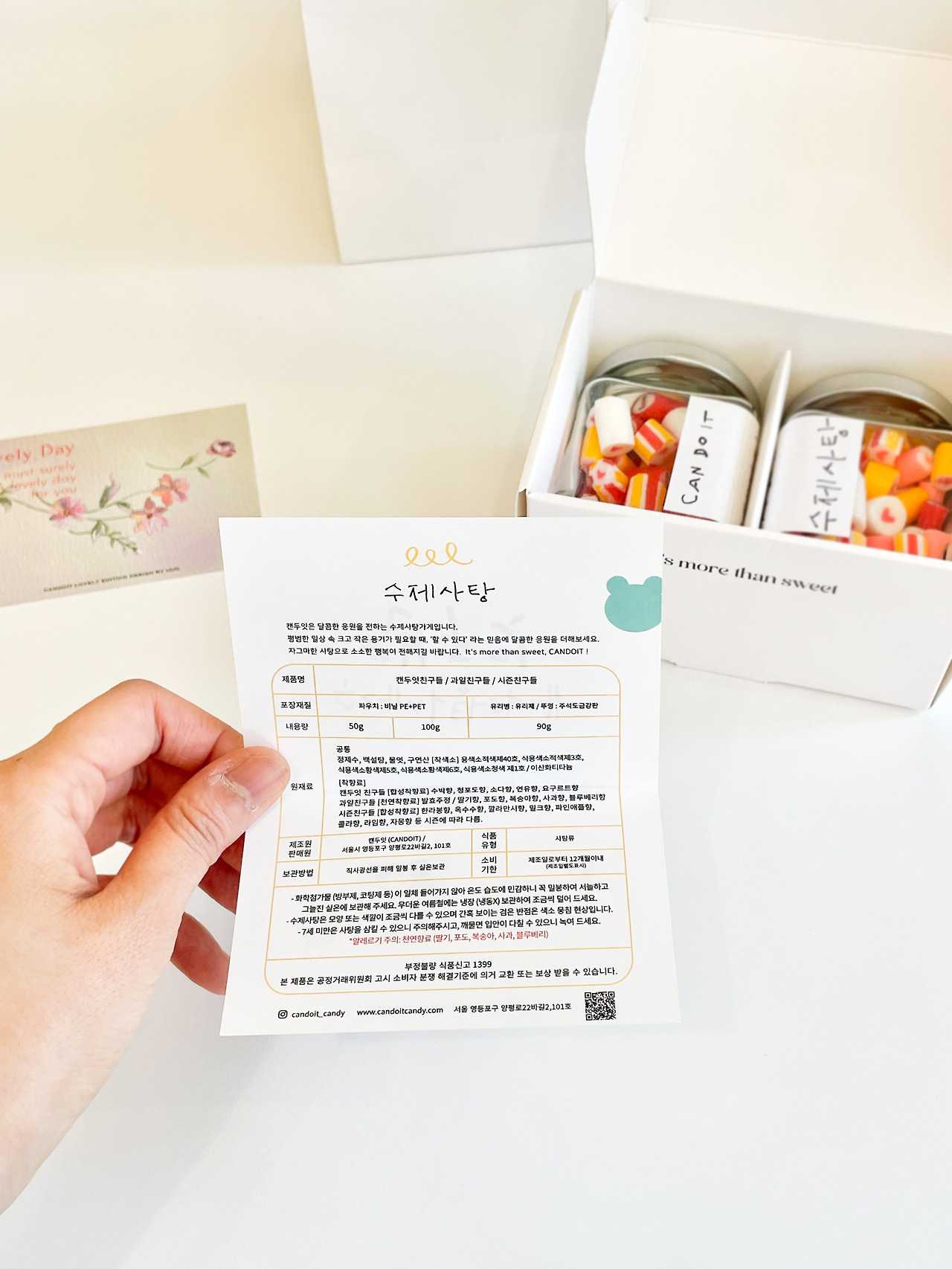 1차로 캔두잇의 전체 디자인이 일단락되고- 틈틈히 시즌에 따른 디자인이 추가되었다. 할로윈이나 크리스마스 시즌 등. 그리고 시간이 지나 더 밀폐력이 좋은 유리병으로 바꾸면서 계획중인 박스 패키지를 이참에 만들기로 결정한 째진. 당시 베트남 출장으로 바빴던 나는 회의에만 참석하고 이번 박스 디자인은 사공혜지가 맡아주었다. 알아서 잘 딱 깔끔하게 센스있게 뽑아준 사공혜지. 종종 사장님의 과한 로고 사랑을 말려주면서 ^^; 평병함 사각 유리병이지만 혜지의 감각적인 캘리와 캔두잇의 영롱한 사탕으로 특별한 패키지가 되었다.