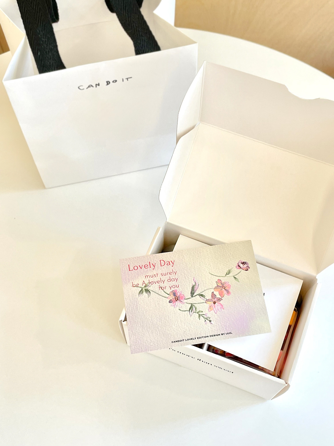한차례 혜지가 디자인을 끝내고 바톤을 이어받아 이번엔 내가 러블리 데이를 위한 (발렌타인 데이+화이트데이= 러블리데이) 홍보 포스터와 1구 박스와 2구 박스에 두루 예쁘게 들어갈 성분표 리뉴얼 버전과 러블리데이 한정 엽서, 비닐패키지 라벨 작업을 하였다. 그리하여 한차례 업그레이드 된 캔두잇.