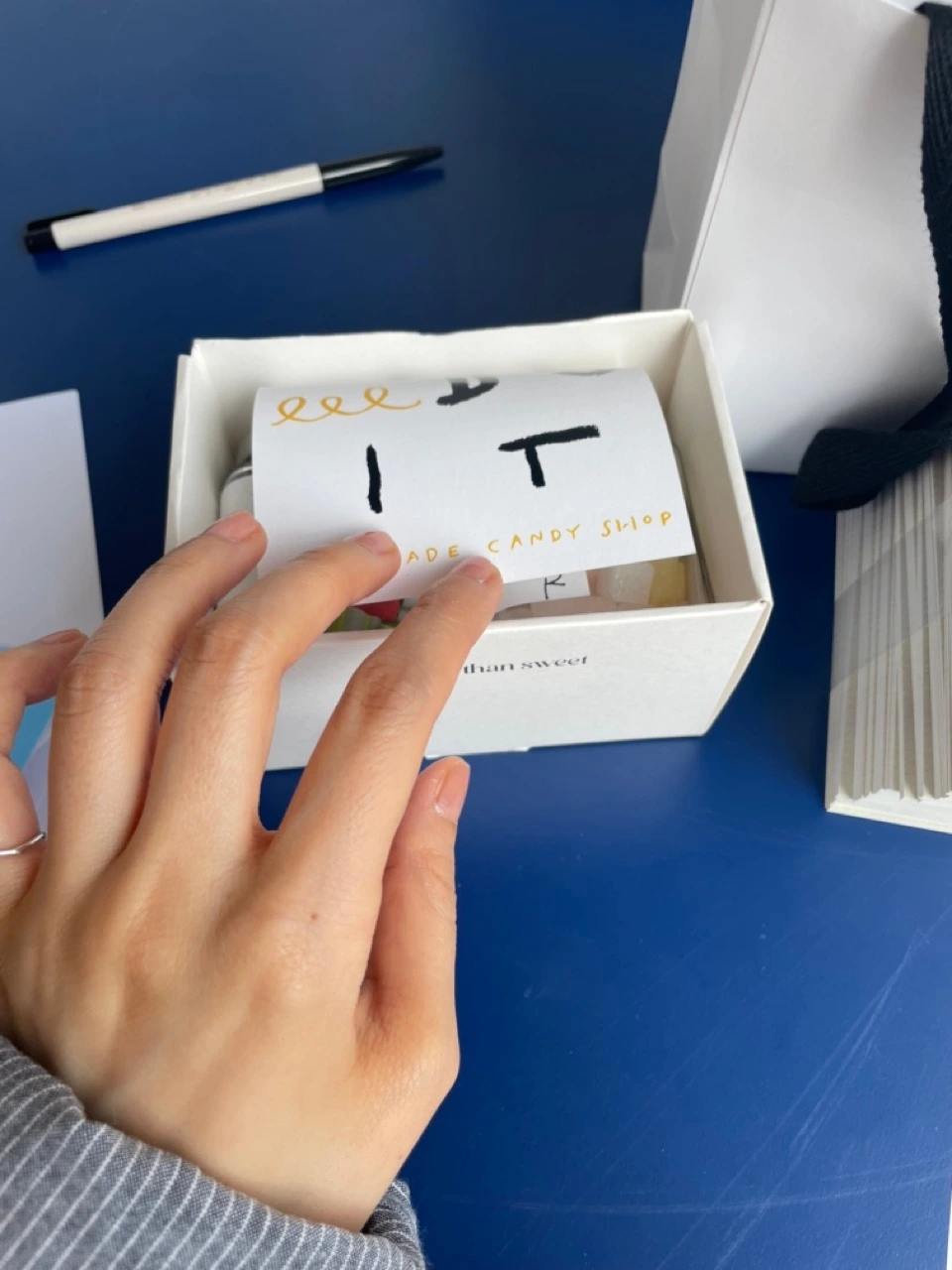제품을 담는 용기가 유리인만큼 박스를 열었을 때 한 눈에 사탕이 잘 보이기를 원해서 스티커를 가능한 작게 만들고 가운데가 아닌 모퉁이에 걸쳐 두르자-는 아이디어는 한 명의 아이디어에서 각자 한번씩 돌아가며 디벨롭되어 완성되었다. ㅎㅎㅎ