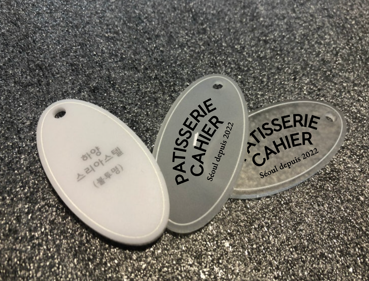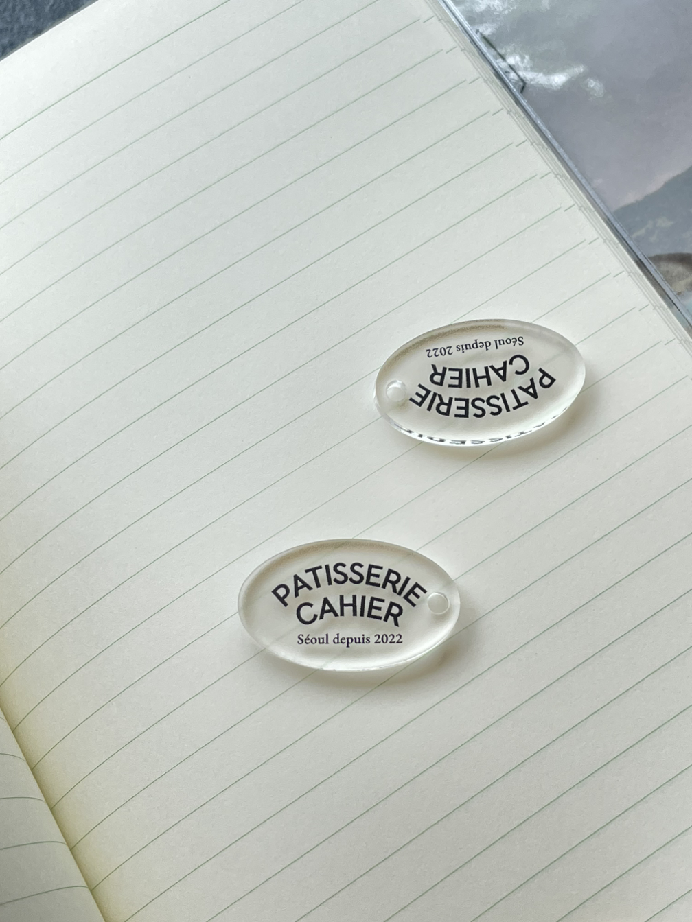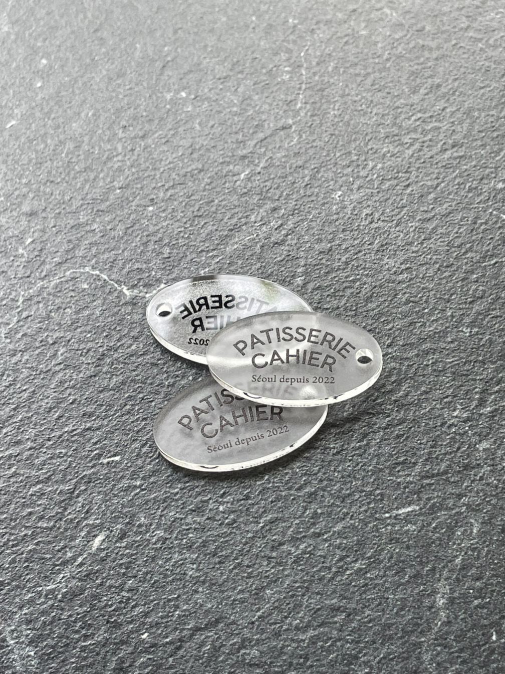 이벤트 굿즈의 본폼이 노트라면 아크릴 엠블럼은 노트의 가름끈을 위해 만들었어요. 필요 없는 부자재는 생략하고 요 엠블럼에 줄을 연결할 예정이에요. 디자인은 굿즈를 받아가게 될 손님이 남성, 여성 누구라도 거북하지 않을 색상과 모양으로 딱 기본, 어디에 두어도 이상하지 않도록 부속품의 역할에 충실하며 굿즈의 본분도 잘 지켜줄...모양으로 제작하였습니다. 위 흰색과 반투명, 투명 중 많은 고민을 하다가 클리어한 소재로 확정되었습니다.