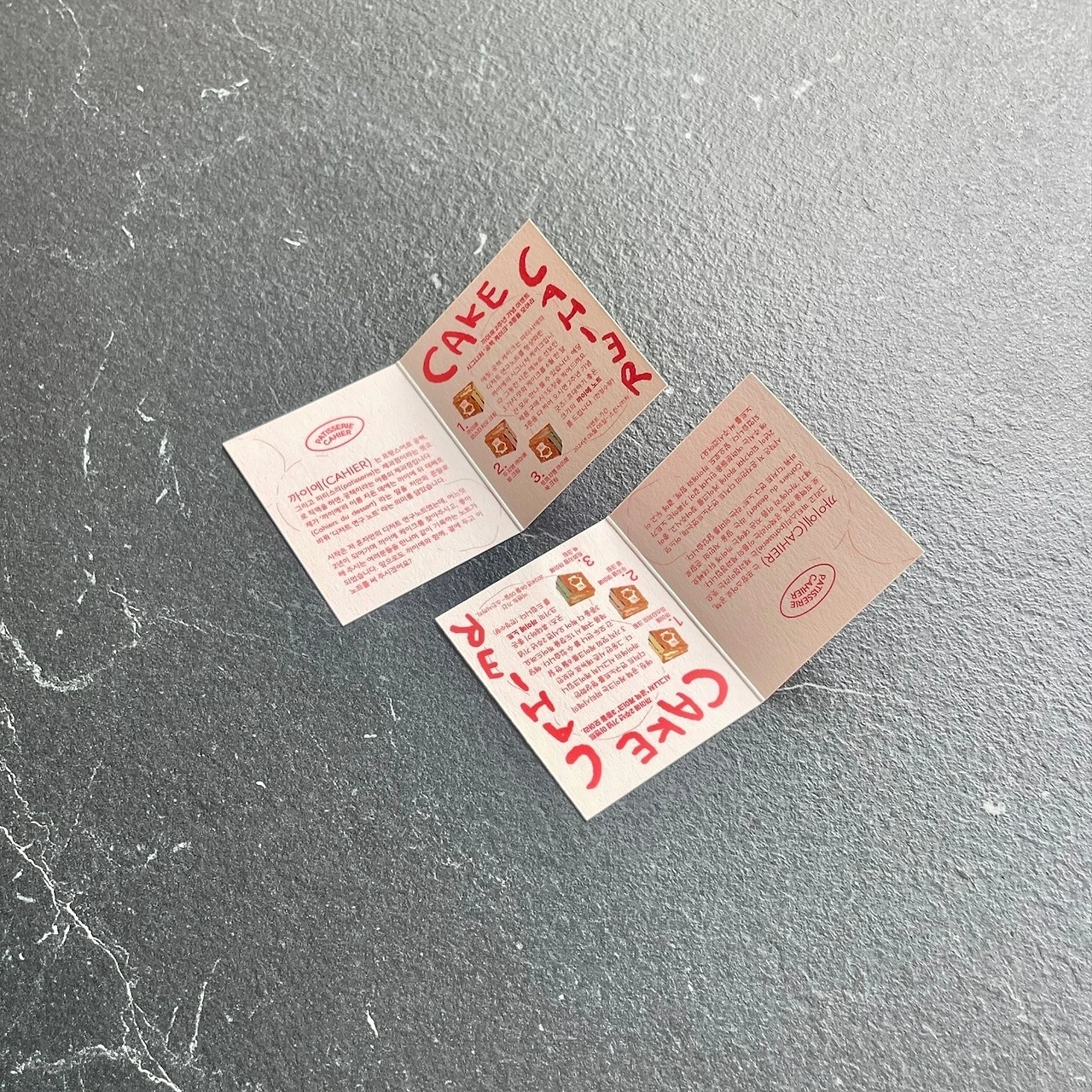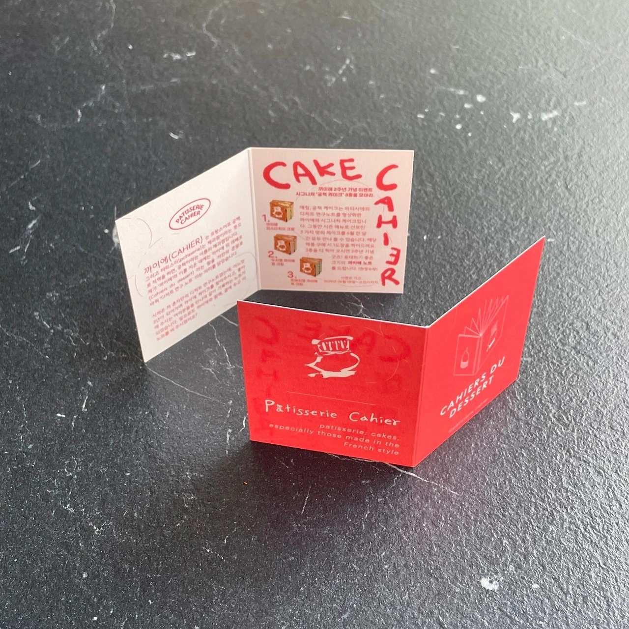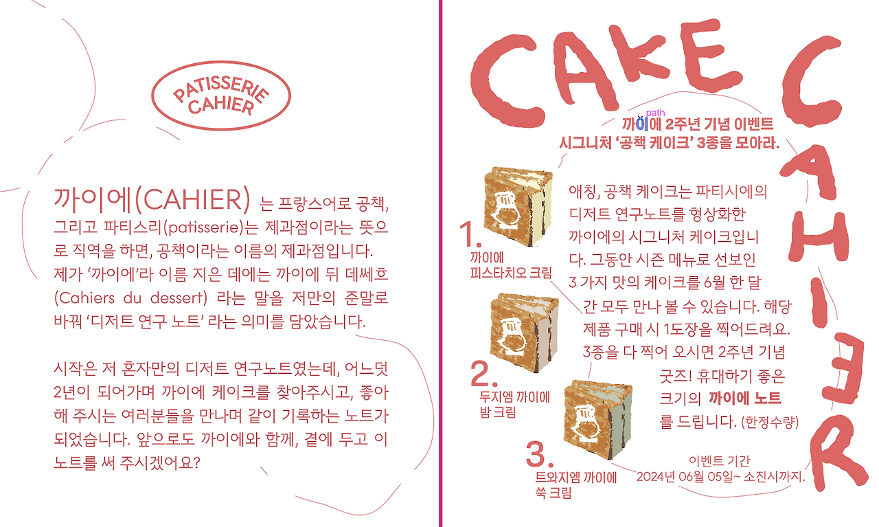 "까이에의 시그니처 케이크인 공책모양 케이크를 1개 구매시 1개의 스탬프를 찍어드리고 3개의 케이크를 모아오시면 굿즈인 노트를 드립니다!" 이벤트 쿠폰은 이벤트의 내용을 담아 알리고 스탬프를 찍는 기능적인 역할을 해요. 이번 외주에서는 이벤트 조건과 리워드 등 프로모션 전체를 사장님과 함께 의논한 부분이 재미있었어요. 사장님께서는 제 의견을 중요하게 들으시고 논의할 부분을 열어두셨어요. 보통 이벤트의 기획은 사전에 정하고 디자이너에게는 딱 디자인만 요청하는 것이 대부분이지요. 그 경우 디자이너가 일하기엔 편하지만 디자이너의 업무는 보기 좋게 만들고 꾸미는 것이 전부는 아니에요. 제작된 제품의 역할 전체를 디자인하는 것으로 좀 더 넓은 영역까지 고려하는 것이 디자이너랍니다. 예를 들면 쿠폰 디자인의 경우 내용과 전달하고자 하는 메시지를 글 뿐만이 아닌 레이아웃, 즉 시선이 머무는 위치, 색상, 시선의 이동까지 고려해서 메시지를 효과적으로 전달합니다. 또 쿠폰만 외따로 단독으로 디자인 되는 것보다 프로모션의 큰 방향을 고려해 쿠폰의 디자인도 정해지게 되겠죠. 그런 큰 틀 전부를 고려해야만 하는데요. 이런 사항을 클라이언트 분의 이해가 미치지 못하면 디자이너에게 부여되는 역할도 축소되고 프로모션의 효과도 떨어질거에요.. 그러니 전체 파이를 한 명의 디자이너에게 맡겨라- 하는 이야기는 아니구요, 디자인 이전에 기획 의도와 목적, 방향성이 먼저 고려되어야 한다는 점이 핵심입니다. 방향성 없이 디자이너에게 일임하자면 기획이 가능한 디자이너를 찾으면 좋구요 당연히 기획 비용은 디자인비와 별도입니다. 무엇보다 업체의 결과 맞는 디자이너를 만나는 것이 중요해요. :)