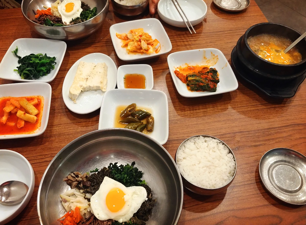 반찬들이 내 눈빛을 읽을 수 있다면 아마 이런 말 따위가 아니였을까. 허기를 채우고 있으면, 금새 메인 메뉴인 비빔밥이 나온다. 냉면 그릇같은 큰 그릇에 상차림에 올라온 나물보다 더 많은 종류의 나물들이 잘게 썰려 있다. 한가운데엔 반숙 계란후라이가 꽃 같이 아름다운 자태로 놓여있다. 자그만 뚝배기에 된장찌개도 보글보글 끓여져 함께 나온다. 아 공깃밥도 함께 나온다. 뚜껑을 열면 흰쌀밥이 꾹꾹 눌러담아져 있다. 밥이 어설프게 채워져 공깃밥 위 공간이 남으면 속은 기분이 드는데, 이곳은 진짜배기다. 공깃밥을 열기 전에 흔들어서 나물그릇에 넣고, 고추장을 넣는다. 나는 된장찌개도 두 국자 정도 넣고 비빔밥을 비벼준다. 된장찌개 국물이 비빔밥을 촉촉하게 만들어줘서 먹을 때 뻑뻑하지 않고 촉촉하니 맛있다. 이제 숫가락이 바빠진다.