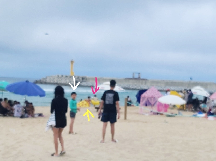 아이가 민트색 래시가드를 입고 있어서 뒤에 배경으로 보이는 사람 무리에서 민트색만 찾았다.