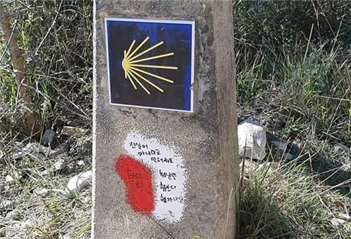 해외 관광지에서 한국인의 낙서가 얼마나 문제였는지, 순례길 오픈 채팅방에 있는 어떤 분은 낙서를 지울 도구를 들고 다니셨다고 합니다. 처음 며칠간 낙서를 지우면서 순례길을 걸으시다가 낙서가 한 둘이 아니라 그만두셨다고 하니, 낙서가 얼마나 골칫거리인지 짐작이 됩니다.