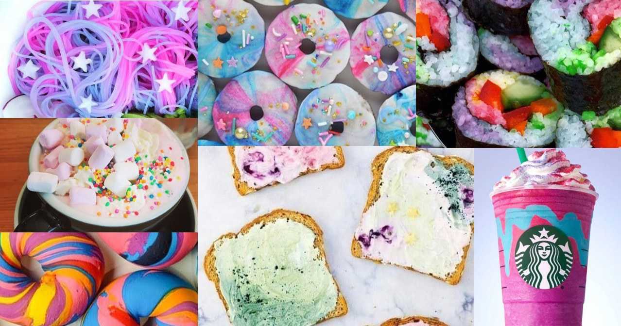 2) 유니콘 푸드 (Unicon Foods) (2017)는 베이글, 토스트 등 다양한 식품에 극도로 밝고 비현실적인 무지개 색상을 입혀 사진용 콘텐츠로서의 가치를 우선시했습니다. 인스타그램의 좋아요를 위한 순수 비주얼 쾌락 추구로 볼 수 있겠습니다.