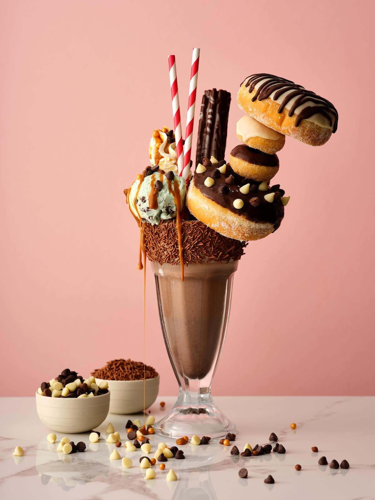 1) 프릭셰이크 (Freakshake) (2016)는 2015년 호주에서 시작되어 2016년 경 전 세계적으로 확산되었습니다. 과도한 토핑과 크기가 특징이며 먹방 콘텐츠와 시너지를 내며 순수한 쾌락을 극대화했습니다.