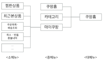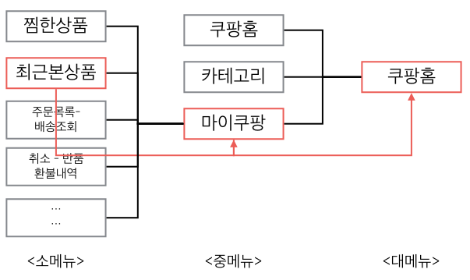 대 메뉴에서 중메뉴 하나(마이쿠팡)을 선택하여 이동하고, 소 메뉴 중 하나(최근본상품)을 선택하여 이동한 경우, 메뉴 구조에서 상위 메뉴로 이동하는 것 즉 Hierarchy Back 은 빨간 선의 이동 방향과 일치한다.