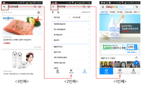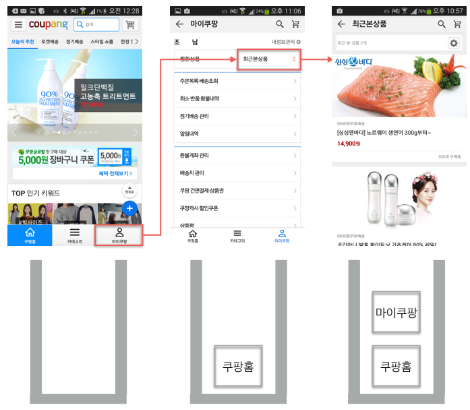 온라인 쇼핑 어느 서비스에서나 볼수 있는 최근 조회 상품으로 내비게이션의 예를 들겠다. 쿠팡에서 최근 본상품을 확인한다고 가정하자. 로그인을 하고, 메인 화면에서 '마이쿠팡' 메뉴를 누른다. 주문 목록, 취소 목록이 모여있는 '마이쿠팡' 메뉴에 접근하여, 우측 상단에 있는 '최근본상품' 메뉴를 눌러 한번 더 이동한다. 2번의 터치로 최근 조회한 상품 목록을 확인 할 수 있다.
