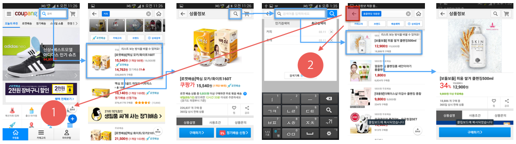 위 이미지는 커피를 조회하다가 폼클렌징을 다시 검색하는 상황을 플로우로 표현한 것이다. 폼클렌징 검색 목록에서 back키(빨간 사각형)를 누르면 어떻게 될까? history back으로 구현이 되어있다면 바로 직전 페이지(2번 동그라미)로, Hierarchy Back으로 구현되어있다면 검색의 상위 개념인 홈(1번 동그라미)로 이동할 것이다. 화면 내에서 다른 화면으로 이동하는 수단(위 예시에서는 상품정보에서의 "검색" 버튼)이 있을때, 화면간에 명확한 back 개념을 잘 정리하지 않으면 사용자는 혼란을 겪는다. 쿠팡은 "<-" 버튼을 History Back으로 기획해, 언제나 이전 화면으로 이동한다.