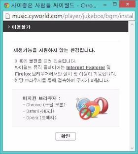 싸이월드라는 사이트를 사례로 들겠다. 과거에 페이스북이 나오기 이전에 소셜 네트워크 서비스로 인기가 있던 서비스이다. 당시에는 인터넷 익스플로러 사용자가 대 다수였다. 크롬으로 접속하면 다음과 같은 화면이 출력된다. 인터넷 익스플로러에서 제대로 보이는 화면이 크롬에서 잘 보이지 않는다.