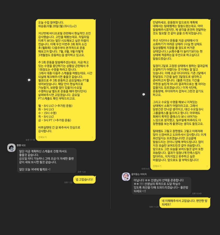 좌) 바디프로필 시작 시점 카톡 대화 / 우) 바디프로필 기간 조정 시점 카톡 대화