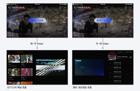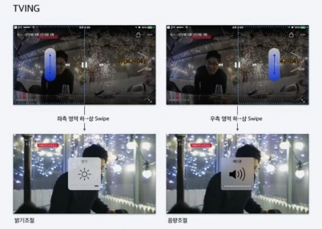 TVING VOD에서는 좌측영역을 상/하 Swipe 하면 밝기조절 기능을, 우측영역을 상/하 Swipe 하면 음량조절 기능을 제공한다. 그리고 좌/우 Swipe를 하면 추천 채널 및 회차 이동 UI를 제공한다. 좌→우 Swipe 하면 '인기 Live 채널' 호출을, 우→좌 Swipe 하면 '회차, 최신방송'을 호출한다.