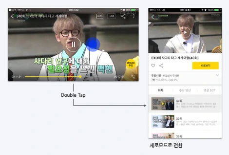 옥수수 VOD에서는 좌측영역을 상/하 Swipe 하면 밝기조절 기능을, 우측영역을 상/하 Swipe 하면 음량조절 기능을 제공한다. 그리고 좌/우 Swipe 하면 재생구간 이동 기능을 제공한다. 이 외에 타사에 없는 새로운 기능을 제공하는 것이 하나 있다. 화면을 Double Tap 하면 가로 모드에서 세로 모드로 전환, 세로 모드에서 가로 모드로 전환한다. 확실히 특이하긴 하지만 유용한 기능인지는 잘 모르겠다.