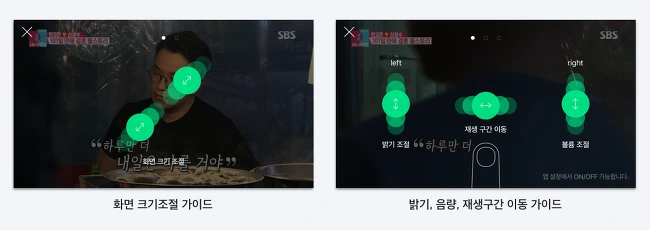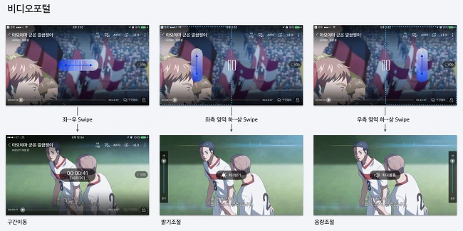 비디오포털 VOD에서는 좌측영역을 상/하 Swipe 하면 밝기조절 기능을, 우측영역을 상/하 Swipe 하면 음량조절 기능을 제공한다. 그리고 좌/우 Swipe 하면 재생구간 이동 기능을 제공한다.