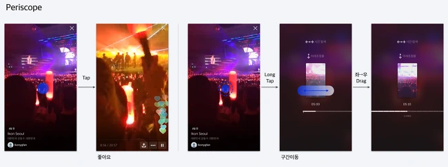 실시간 개인방송을 지향하는 페리스코프에서도 VOD를 제공한다. 페리스코프는 기본적으로 세로 모드 영상을 제공하는 것이 특징이다. 페리스코프에서는 VOD 영상을 Long Tap 하면 구간 탐색 기능을 제공한다. 조금 특이한 방식이고, 재미있기는 한데 전체 영상 시간을 직관적으로 알 수 없고, Gesture를 이어서 진행하기에는 불편한 느낌이다. 구간탐색 모드에서 구간탐색은 좌/우 Drag로 이동하고, 좌/우 구간탐색을 하는 중에 상/하 이동을 같이 수행하면 미세 조정이 가능한 방식으로 되어있다.