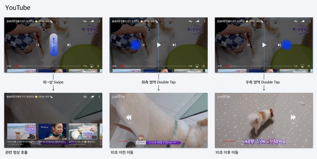 Youtube VOD는 기본적으로 영상을 한번 탭 하면 관련 버튼들이 호출되고, 다시 탭 하면 사라지는 방식으로 제공된다. (다른 동영상 플레이어도 유사한 방식을 제공한다) 그리고 VOD 영상의 좌측 영역을 두 번 탭 하면 10초 이전으로, 우측 영역을 두 번 탭 하면 10초 다음으로 이동한다. 또한, 세번 탭 하면 20초, 네번 탭 하면 40초 단위로 이동한다. 즉 해당 기능을 재생구간 이동 용도로 활용하고 있다. 이건 최근에 추가된 기능인데, 영상에서 하→상 방향으로 Swipe 하면 관련 동영상 목록을 불러올 수 있다. 이는 단순히 하나의 영상을 감상하기만 하는 것이 아니라 다양한 영상을 쉽게 탐색할 수 있도록 하는 기능을 강조하려는 의도라고 생각한다.