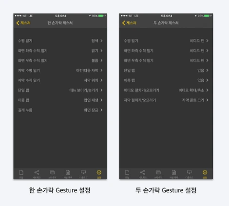 N Player의 경우 좀 더 나아가서 Gesture를 별도로 커스터마이징 할 수 있는 기능을 제공한다. 모든 설정이 귀찮듯, 커스터마이징을 사용자에게 전부 맡길 수는 없겠지만 필요에 따라 사용자의 성향과 상황에 맞는 Gesture를 제공할 수도 있겠다.