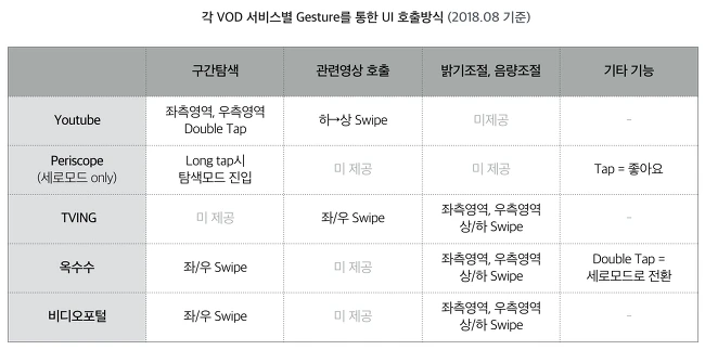 한 가지 흥미로운 점은 대부분의 국내 서비스는 상/하 Swipe 하면 밝기조절과 음량조절을 제공한다는 것인데, 정작 해외 사례를 보면 상/하 Swipe를 다른 부가적 기능으로 활용(관련 동영상 호출)하거나, 해당 Gesture를 사용하지 않는 것을 파악할 수 있었다. 또한, 대부분의 국내 서비스에서는 좌/우 Swipe는 구간 탐색 기능이나 관련 영상 호출 기능으로 활용하는데 해외 사례에서는 좌/우 Swipe Gesture를 활용하지 않는 경우가 대부분이었다. 상/하/좌/우 Swipe 기능이 잘 활용이 되면 유용하겠지만, 사용자의 입력 오류를 발생시킨다는 점을 고려해 신중히 활용되어야 할 것이다.