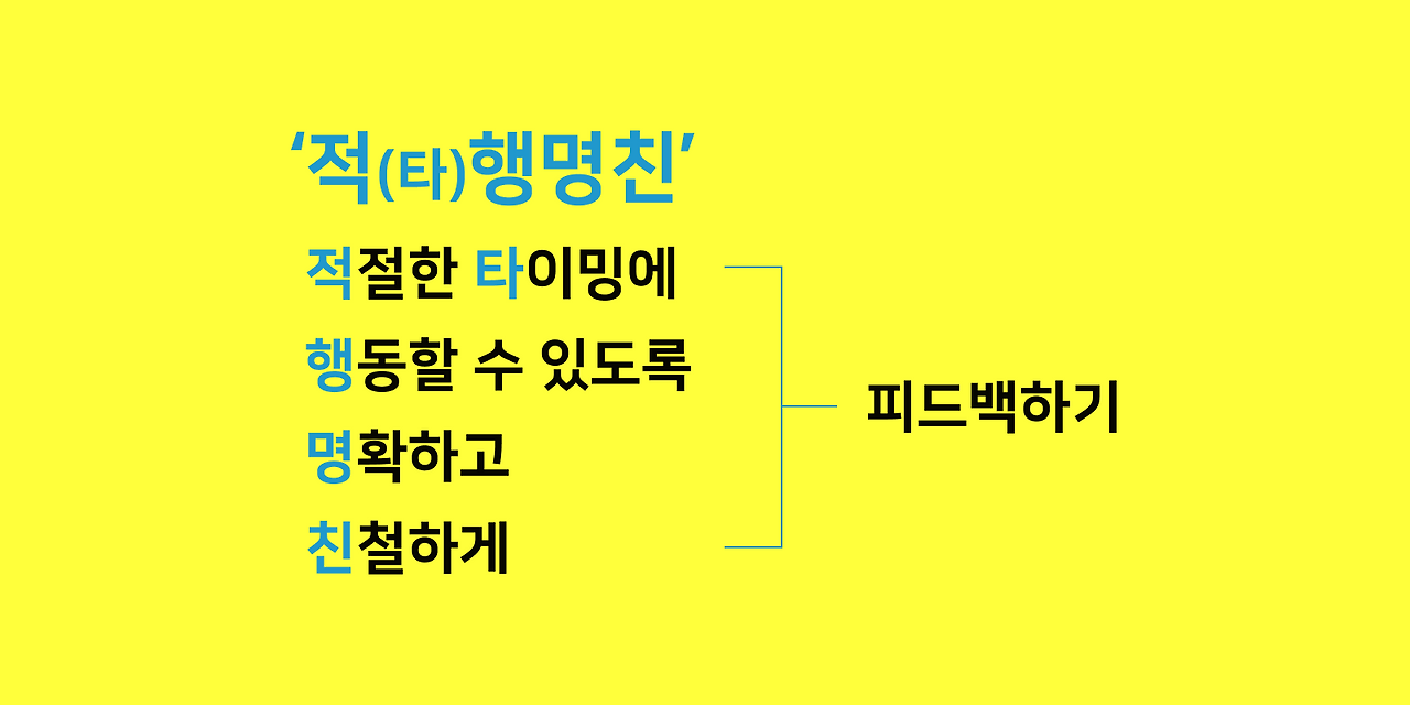 '명확하고'는 말 그대로 두리뭉실한 피드백이 아닌 이해할 수 있는 피드백을 말하고, '친절하게'는 피드백은 남을 지시하고 가르치는 것이 아니라 성장을 위한 진실된 말이기 때문에 상대방이 받아드릴수 있는 친절함이 필요하다는 것입니다.