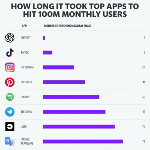 UBS 보고서 (2023)는 ChatGPT가 론칭하고 불과 2개월 만에 월간 활성 사용자 1억 명을 돌파했다고 보고했습니다.