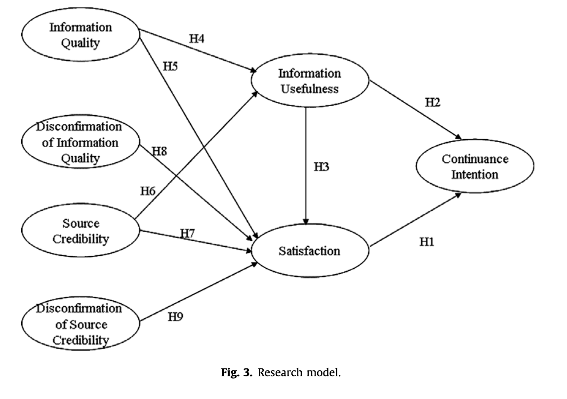 본 논문에서는 기존의 연구를 살펴보고 정보의 지속 사용 의도에 영향을 미치는 요소를 설명할 수 있는 모델을 만들기 위해 앞서 설명한 각 요소를 이용해 가설을 세웠고, 가정한 요소 간의 관계는 다음과 같습니다.