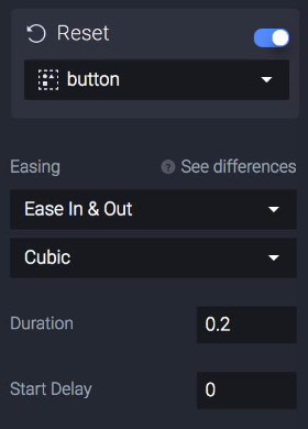 예시 Rotate가 들어간 개체를 리셋한다면 초기값이 Rotation 0 인 레이어에 Rotate to 220인 경우이므로 실행시에는 0 -> 220으로 돌고, 리셋하면 220 -> 360(=0)으로 돌게 됩니다. (원래자리로 돌아오는 회전방향 유지하는 Rotate) 또, 같은 경우에서 Rotate by 40인 경우에 실행시는 0 -> 40으로 돌고 리셋하면 40 -> 360(=0)으로 돌게 됩니다. 두번 세번 한다면 0-> 80 / 120 -> 360(=0) (역시 이 경우에도 회전 방향을 유지하고 초기값으로 돌아옵니다) (예시 - rotate)