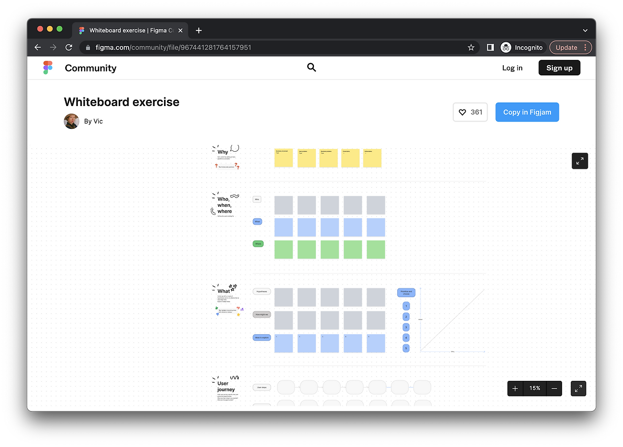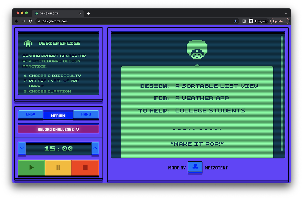 나는 가끔 동기들이랑 비디오 콜에서 만나 Figma에 주제를 띄워놓고 화이트보드 챌린지 연습을 했었는데, 같이 연습하니 혼자서는 생각하지 못했던 부분을 알게 되어 좋았다. 혼자 연습할 때에는 아래 이미지 예시의 화이트보드 챌린지 제너레이터(https://designercize.com/)나 인터넷에 많이 돌아다니는 화이트보드 챌린지 주제 예시들을 활용하여 연습을 해봤는데 도움이 되었다. 또한 문제를 풀 때 프레임워크를 활용하면 시간 분배에 도움이 되는데, FigJam에서 화이트보드 챌린지용 프레임워크(링크) 등을 참고하면 된다.