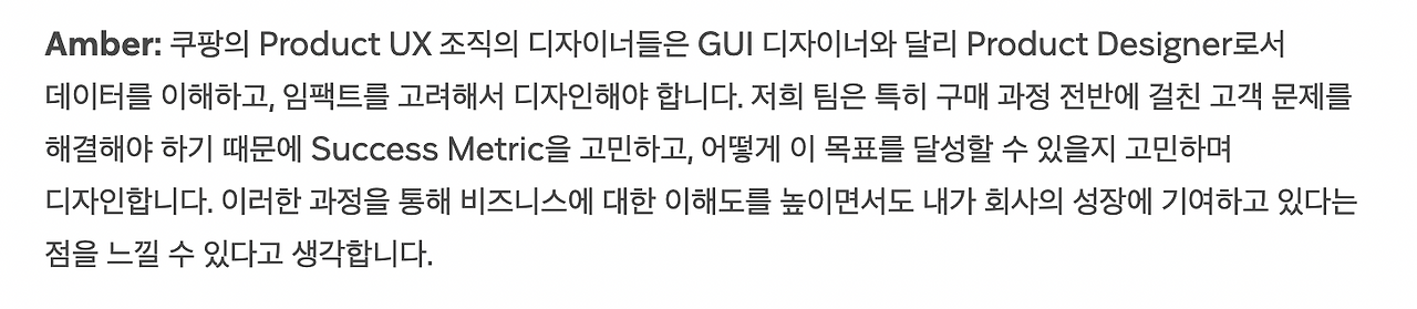 단순히 직무 통합을 넘어서 PO(Product Owner)의 영역까지 생각하며 비즈니스 임팩트를 만들어내는 디자이너를 글로벌 시장이 원한다는 사실은, 이번 상반기 면접에서 얻은 가장 큰 내면적 성과였다. 이 부분은 특히 Exponent라는 유튜브 채널의 구글 UX디자이너 인터뷰에서도 잘 나와있다.
