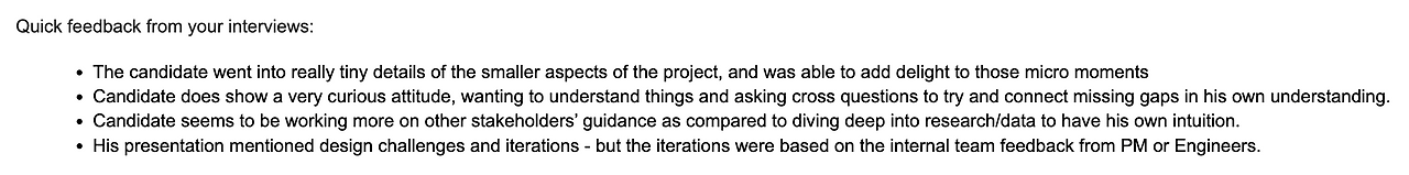 또한 문제 해결 과정을 '개발팀, 기획팀과 토론을 통해 결정했습니다.'라고만 전달한 부분도 패착이었다. Grab은 매 인터뷰마다 놀랍게도 면접관들의 피드백을 종합하여 전달해준다. 그중 내가 받은 '단점 피드백'으로는 '해당 지원자는 본인의 직관을 가지기 위해 리서치/데이터를 들여다보는 것보다 다른 이해관계자의 가이드를 더욱 따르는 것 같습니다.'라는 것이었다.