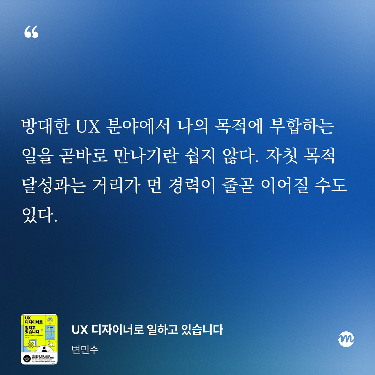 지금 하고 있는 일이 내가 원했던 UX와 거리가 멀더라도 너무 낙담하지 않아야 한다. 어떤 경험도 절대 헛되지 않기 때문이다. 적어도 안 맞는지를 알았다는 것도 성과다. 이제 원하는 옷으로 바꿔 입는 노력만 해내면 된다.