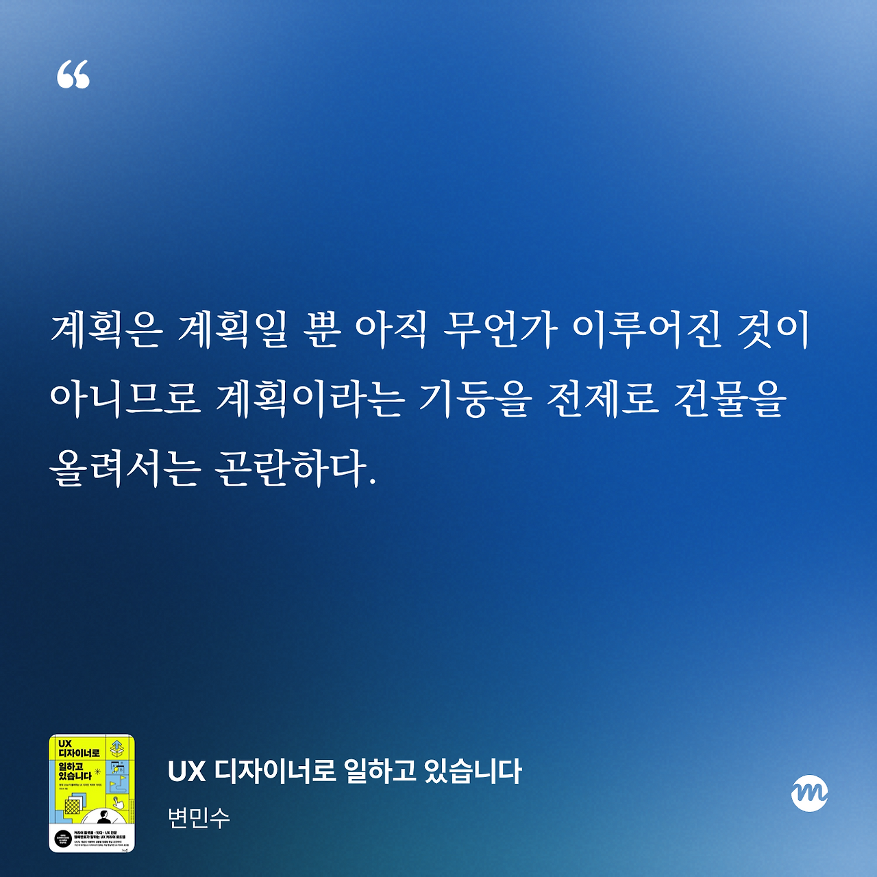 따라서 ‘계획은 계획일 뿐이다’라는 말은, 계획을 무시하라는 뜻이 아니라 ‘계획을 절대시 하지 말고 실행과 병행하라’는 의미로 받아들이는 것이 현명하다. UX 직무는 특히 실행을 통해 학습하는 성격이 강하기 때문에, 초반에는 완벽한 계획보다 빠르고 가벼운 실험을 통해 진짜 문제를 찾아가는 것이 더 중요하다.