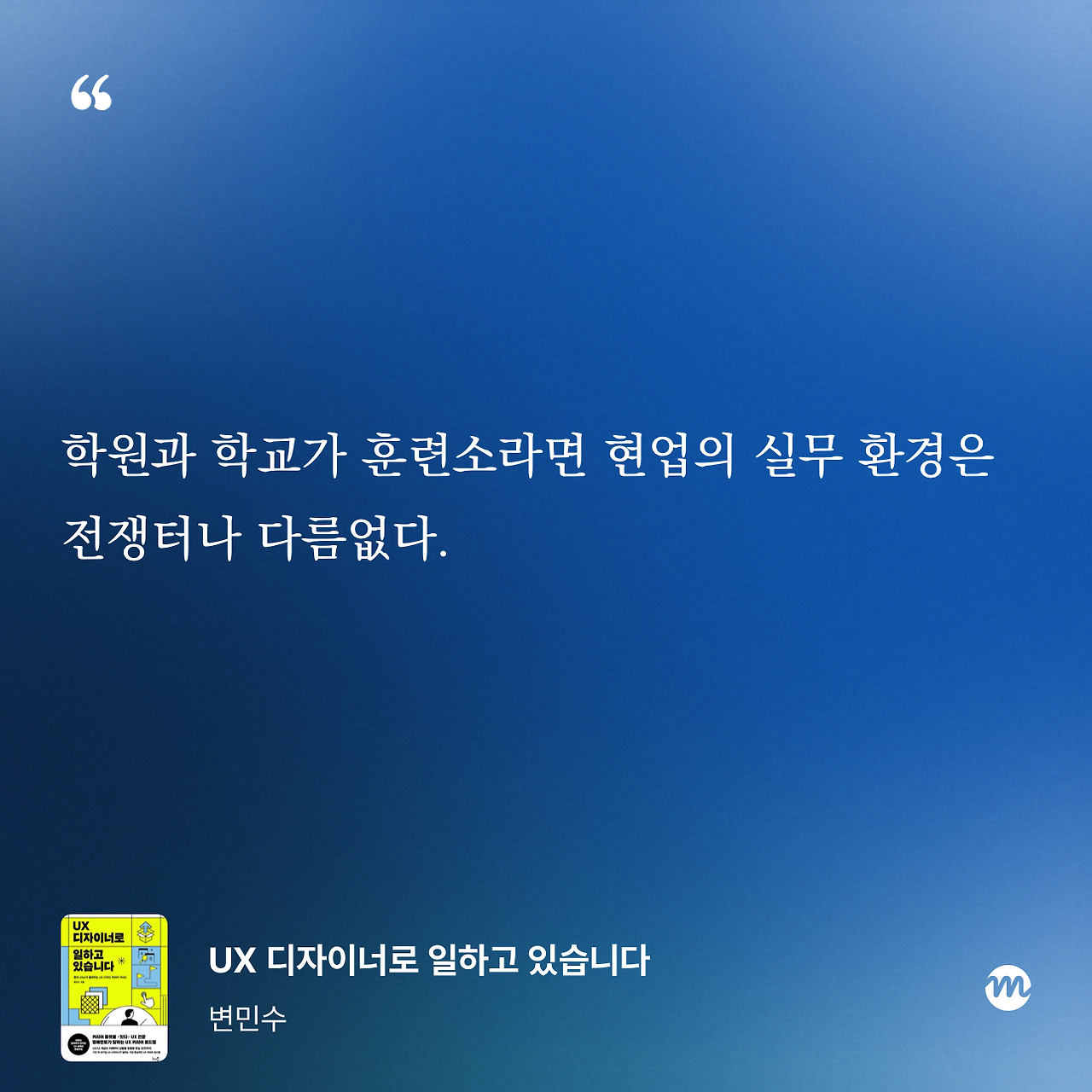학원과 학교에서의 UX 교육이 실무에 비해 매우 제한적이고 간접적인 경험을 강조하고 싶었다. 그렇다고 해서 이러한 교육이 무용하단 뜻은 결코 아니다. 현업의 실무 환경은 마치 ‘전쟁터’처럼 느껴질 만큼 치열하고 복잡하기에 오히려 이러한 교육에 더해서 공포감을 씻어주는 활동이 첨가되어야 한다는 의미에 더 가깝다. 아무리 현장이 불규칙적이고 아수라장이더라도 정규교육의 가치가 부정될 수는 없다.