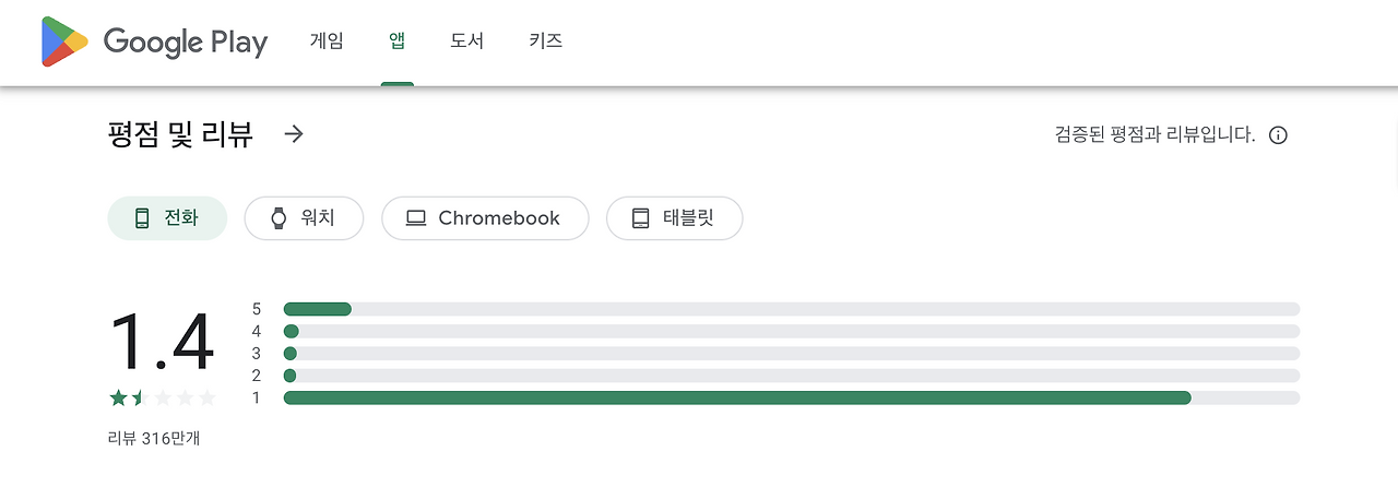 심지어 앱스토어에서는 별점은 높아도 그 내용은 냉소적인 모습도 관찰되었다. 아니나 다를까 노출 구조 때문에 별 다섯 개와 함께 조소 섞인 의견을 남기는 리뷰가 잇달았다. 양대 스토어에서 압도적인 1점 세례와 냉소적 5점이 공존하는 아이러니가 벌어졌다.