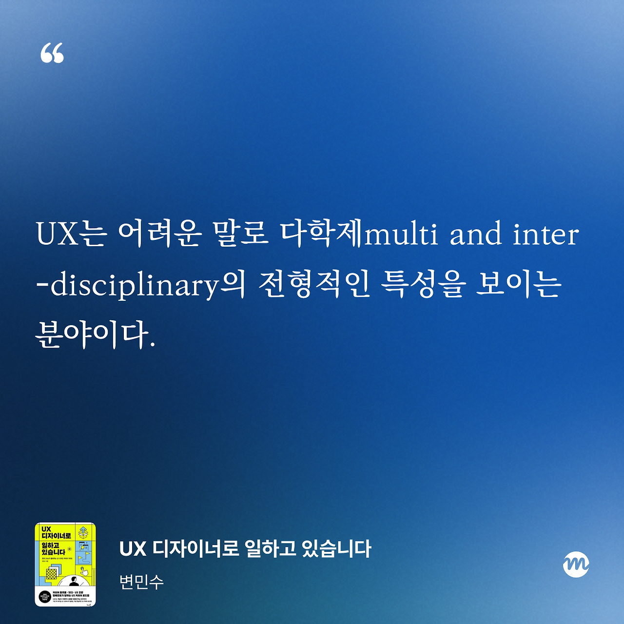 UX(User Experience)는 이름만 보면 단순히 ‘사용자의 경험’을 다루는 일처럼 보이지만, 실제로는 수많은 전공과 전문 분야가 결합되어야만 제대로 된 결과물을 만들어낼 수 있는 매우 복잡한 작업이다. 그렇기에 UX는 전형적인 다학제적 분야(multi-disciplinary, inter-disciplinary)다. 이 개념을 한 번 살펴보자.