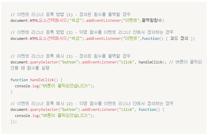 이벤트 리스너는 정의된 함수를 콜백하는 방식과 익명의 함수를 정의하는 방식으로 정의될 수 있음