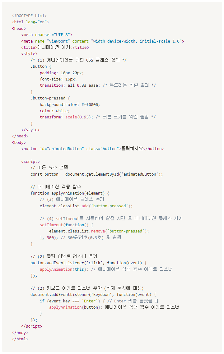 (3) 애니메이션 적용: 이벤트 발생 시 해당 요소에 애니메이션 클래스를 추가
