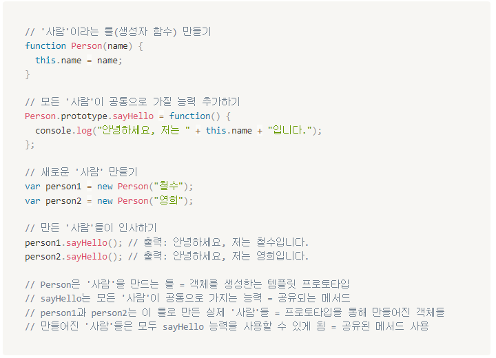 메서드 공유: 프로토타입을 통해 메서드를 정의하면, 해당 생성자 함수로 생성된 모든 인스턴스가 메서드를 공유 → 메모리 사용을 줄이고 성능을 향상