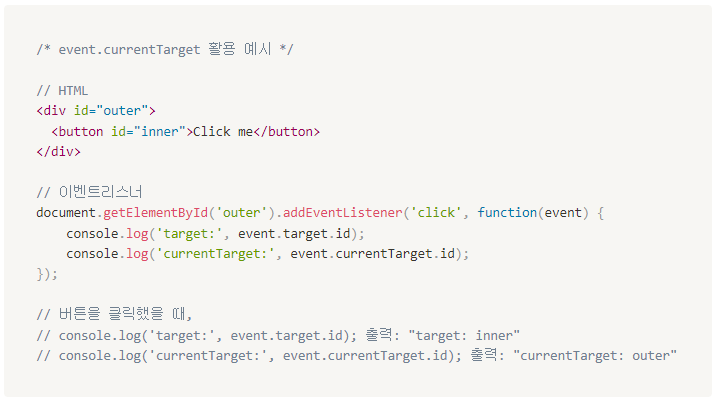 currentTarget: 현재 이벤트 핸들러가 연결된 요소를 가리킴 ⇒ 컨테이너 요소에 이벤트 리스너를 정의하고 컨테이너 내 하위 요소가 이벤트를 트리거할 경우, target은 하위 요소를 반환하지만 currentTarget은 컨테이너를 반환
