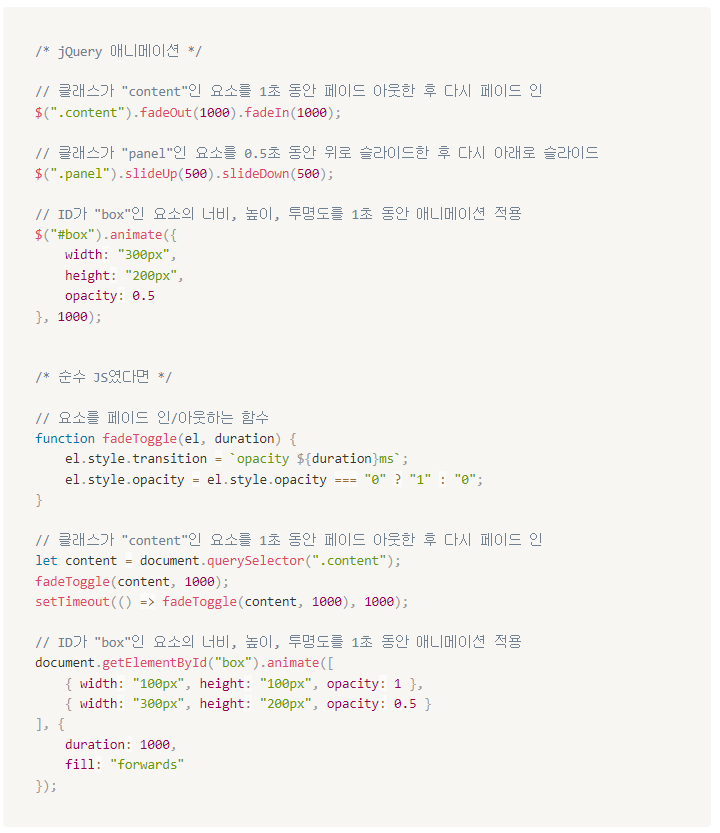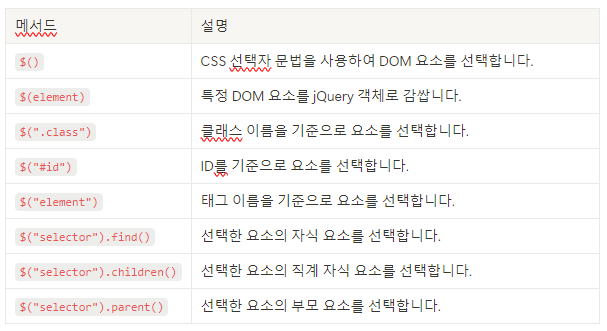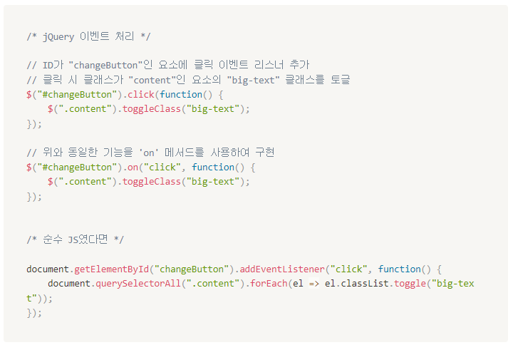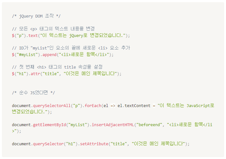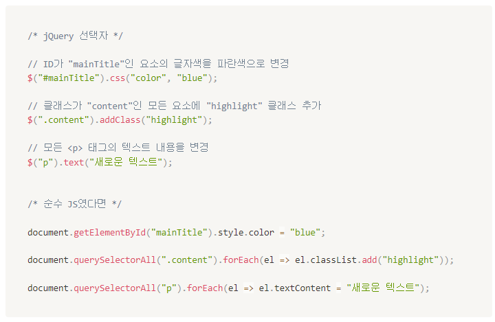 jQuery는 JavaScript 라이브러리로, HTML 문서 탐색과 조작, 이벤트 처리, 애니메이션 및 Ajax를 훨씬 간단하게 만들어줌 ⇒ "Write less, do more"라는 모토로 유명