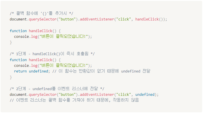 함수를 콜백할 경우, 이벤트 리스너 안에서 ‘()’를 사용하면, 콜백을 하려던 함수가 즉시 호출되어 반환값을 형성하고, 그 반환 값을 이벤트 리스너에 전달하기 때문에 제대로 작동하지 않을 수 있음