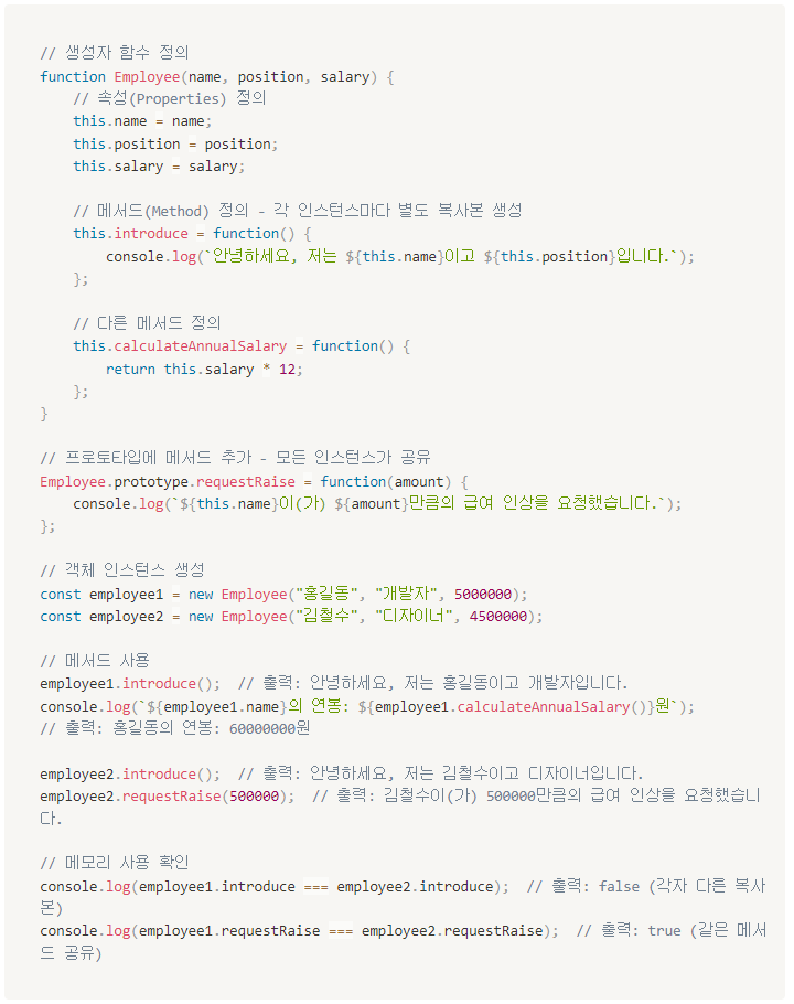 생성자 함수 객체 내에 메서드를 포함시키면, 각 객체 인스턴스가 자신만의 메서드 복사본을 갖게 됨