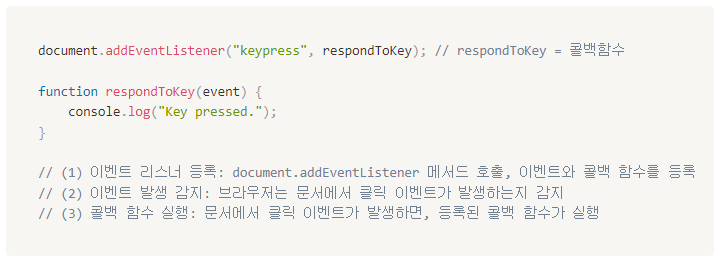 사용자 정의 이벤트 리스너 함수의 인자에는 (1) 대상이 될 요소, (2) 감지할 이벤트의 유형, (3) 이벤트 발생시 콜백 함수로 구성