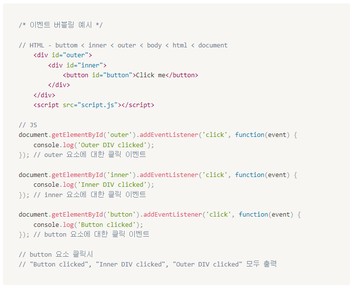 이벤트 버블링(Event Bubbling)은 웹 브라우저에서 이벤트가 발생할 때, 그 이벤트가 해당 요소에서 시작하여 상위 요소들로 전파되는 현상을 말함