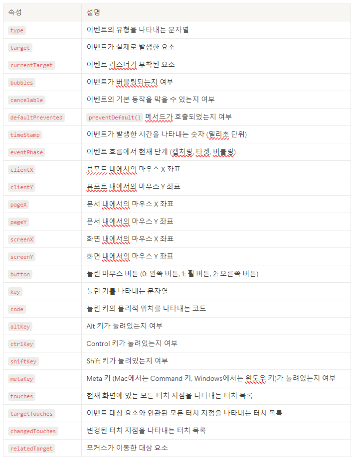 이벤트 객체는 자바스크립트 객체(JS object) 형태이기에 속성을 활용할 수 있으며, 이벤트 객체에 대한 메서드를 활용할 수도 있음