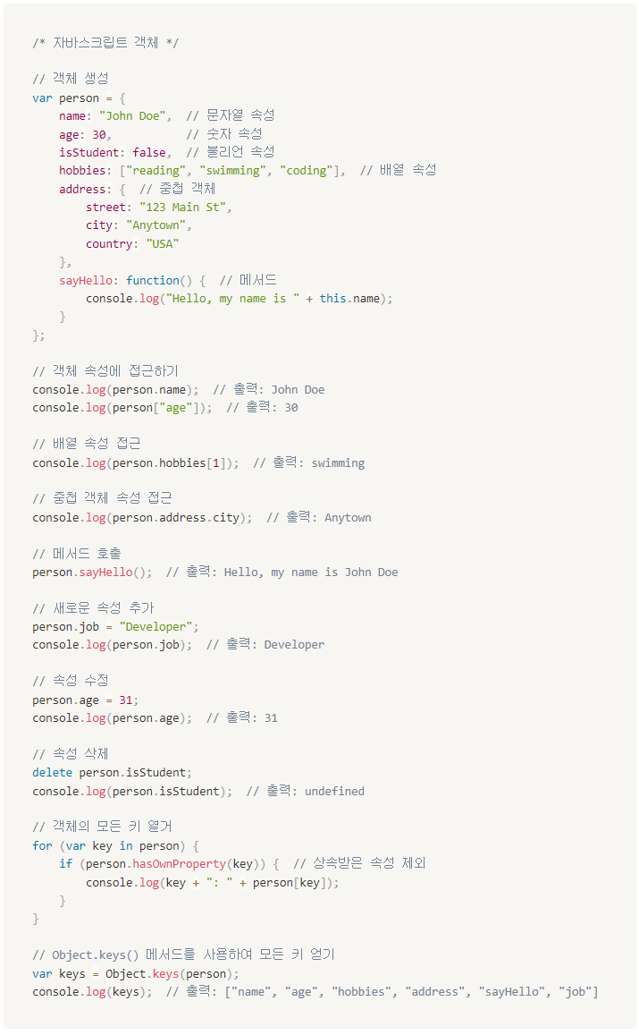 객체는 중괄호 {}로 정의하며, 속성은 콜론(:)으로 구분된 키와 값의 쌍으로 표현, 여러 속성은 쉼표(,)로 구분