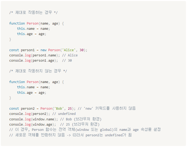 new 키워드와 함께 호출하여 새로운 객체 인스턴스를 생성 → 생성자 함수 호출시 new로 새 객체를 초기화를 반드시 해야함