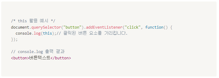 this 키워드: this는 이벤트를 트리거한 DOM 요소를 가리키는 키워드
