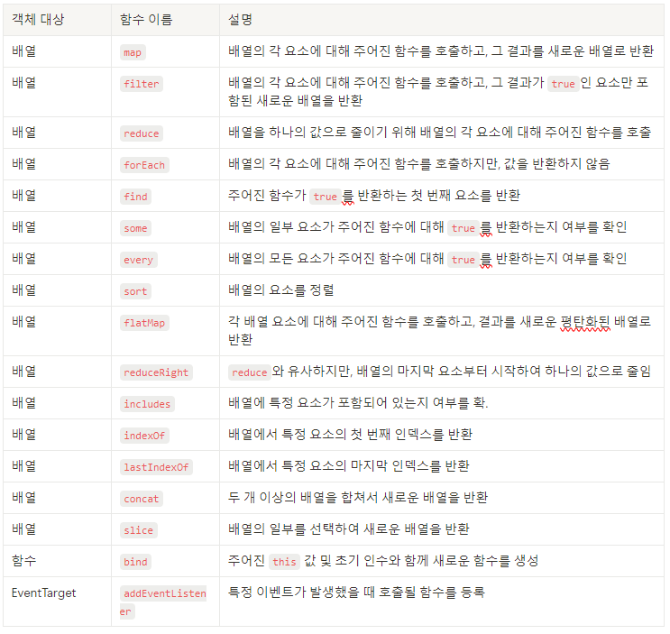 코드의 재사용성과 추상화 수준을 높이는 데 사용됨 → 자바스크립트에서 함수는 일급 객체(First-class Citizens)이기 때문에 고차 함수의 구현이 가능